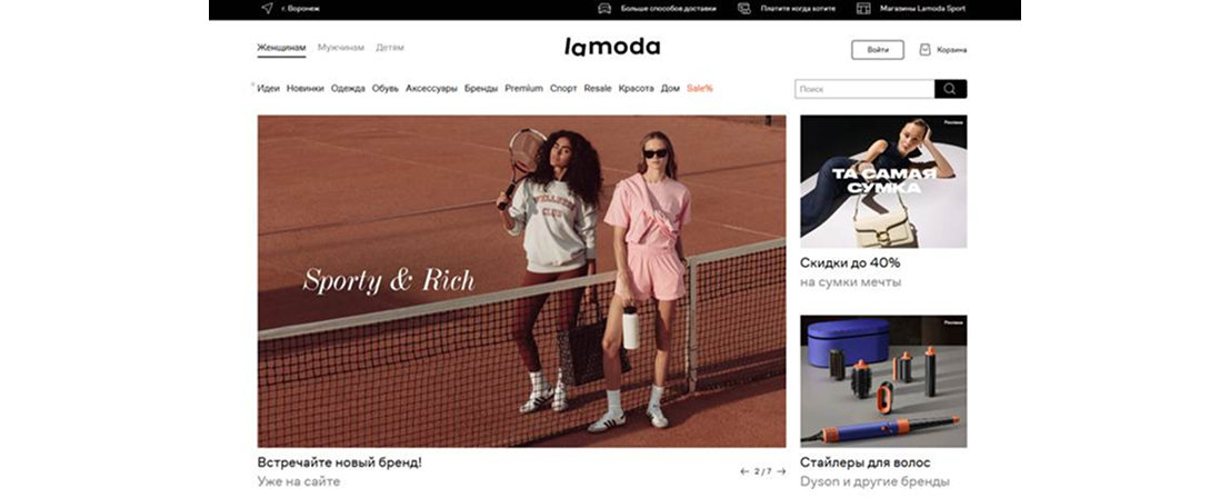 Пример: www.lamoda.ru — на главной странице крупным баннером чётко акцентируется внимание на новом бренде, предложена акция на определённую категорию товаров, реализован быстрый переход к популярному ассортименту. Нет визуальной перегрузки, видим только то, что важно на данный момент.