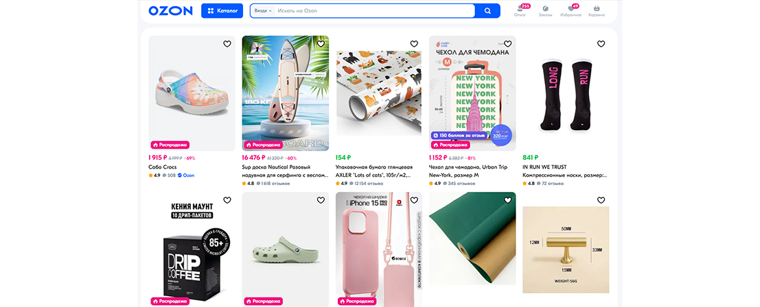 Пример: www.ozon.ru — реализует персонализированный подход для пользователей. Например, если вы просматриваете товары определённой тематики или бренда, то на главной начнут появляться подборки и акционные предложения именно на основе ваших интересов. Это удерживает внимание и делает взаимодействие более осмысленным.