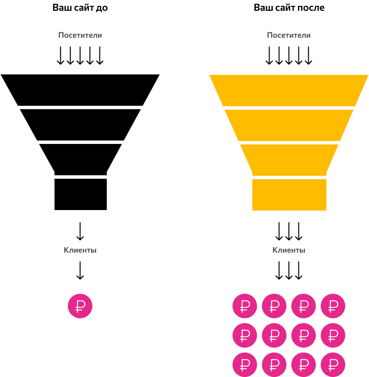 Рост продаж достигается за счет увеличения конверсии сайта — роста количества покупателей при неизменном количестве посетителей.